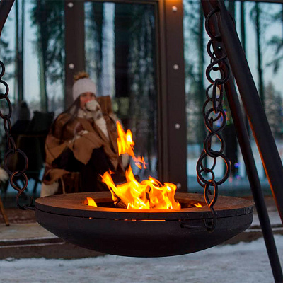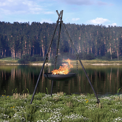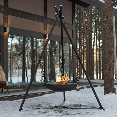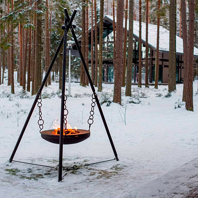 Высота треноги - 2,8 метра. Чаша располагается на высоте 55-60 см от земли, но при желании количество звеньев цепи можно сократить, а чашу поднять выше.