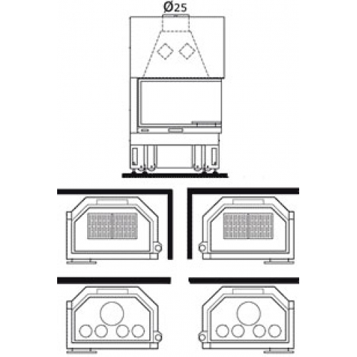 Два варианта исполнения, различающиеся по способу распределения горячего воздуха в помещении: естественная конвекция (N) и принудительная вентиляция (V). В коробе имеются 4 отверстия для подключения к системе разводки горячего воздуха. Топка снабжена системой вторичного дожига.